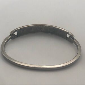 Vintage sterling silver and square abalone inlay bangle bracelet. Bracelet pinches and hooks / unhooks as the clasping mechanism.
