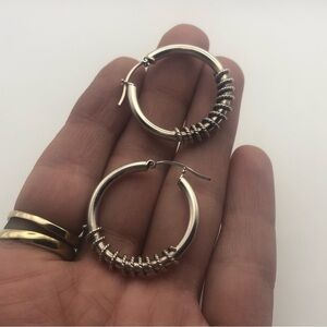 Vintage 925 Italy sterling silver hoop earrings with cable rope twist accents in middle.