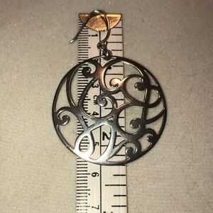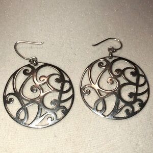 Beautiful vintage sterling silver circular filigree vines design dangle statement earrings w shepherds hook posts.