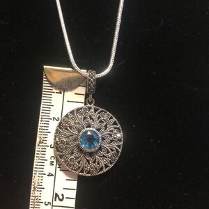 Vintage Sterling Silver Marcasite Blue Topaz Floral Filigree Pendant , beautiful and ornate, the marcasite stones glimmer in the light while the blue topaz is a bright colour of blue. Stamped NF 925 Thailand.