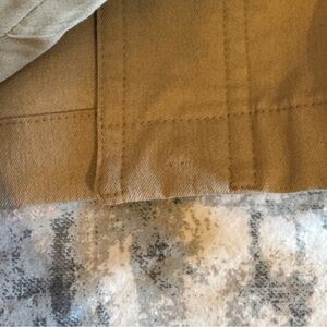 Jacket is missing one button at the very bottom, however a replacement button is attached to the materials tag so the button can easily be replaced. There is a tiny bleach stain on the left arm. Missing button and bleach stain shown in photos. Otherwise in excellent condition with very little wear.