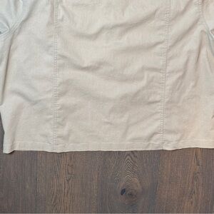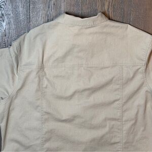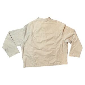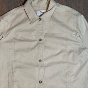 Classic vintage utility jacket from Tilley Endurables, made in Canada, featuring two front pockets, a button up front closure, and two additional pockets on the inside. Color is a very light tan/cream/beige.
