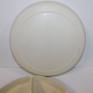 This Vintage 13" Tupperware Divided 7 Compartment Veggie Vegetable Chip Round Serving Tray 1666-1 with lid is in great clean condition. Features 6 Vegetable / Chips / Fruit Serving sections with round center spot to put dip ( doesn't come with dip container but will fit various standard dip bowls on the market).