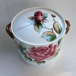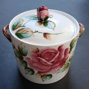 VTG Victorian Style Cookie Jar Canister Embossed Roses Rose Bud Finial 1950s Lef