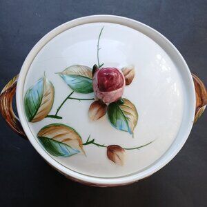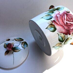 Hand painted, raised 3D design of roses, buds and foliage on both sides of the jar and on the lid. .