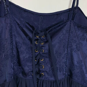 In gently used preowned condition. Note that approx measurements can vary because of the corset tie up back that makes the fit varied. Minimal loose threads most notably around adjustable straps. Small run to sheer slip. Please see pictures for approximate measurements, care and fabric details and examples of condition. Please reach out if you have any questions.