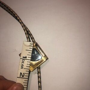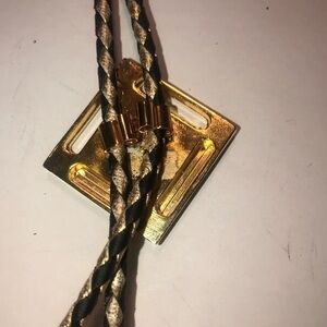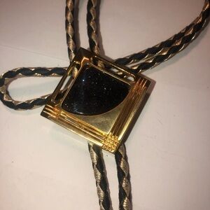 Vintage western arrow shaped necktie with square navy blue sparkly stone accent on braided fabric black and gold rope. Total length Is 36” adjustable