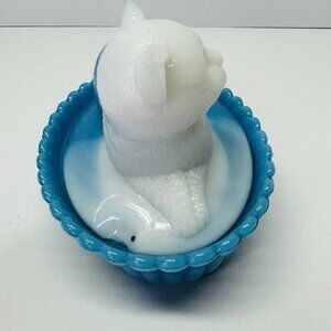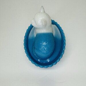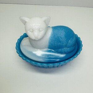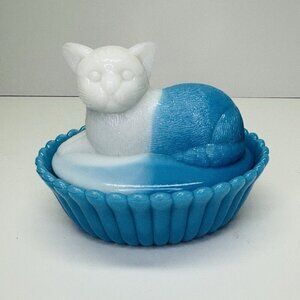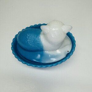 Vintage Westmoreland Blue/White Slag Glass Cat on Nest Covered Dish 5 1/2" *Chip