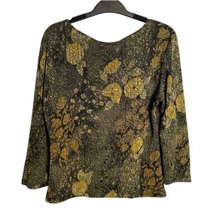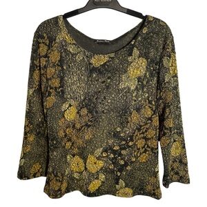 Gorgeous textured top from vintage brand Brittany Black, size M. Features 3/4 sleeves and an all over textured print, in earthy forest tones. Acetate and spandex blend. The perfect goblincore piece 🌳