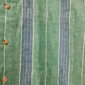 striped shirt, menswear, short sleeve shirt, Woolrich shirt, button-up shirt, casual top, lightweight shirt, green blue shirt, summer shirt, cotton shirt, vintage Woolrich, collared shirt, Vintage, Woolrich, Green, Blue, Stripes, Casual, Button Up, Office, Cotton, Lightweight, Mens Short Sleeve, Mens Medium, Size M, Made in Singapore, Singapore, Buisness Casual, Relaxed