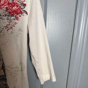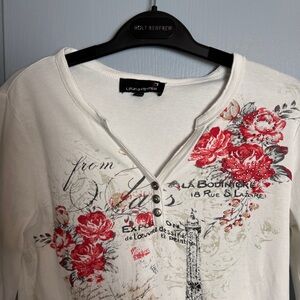 Super cute vintage Y2K henley from Laura with 3/4 sleeves and a fairy grunge print on the front of the Eiffel Tower, vintage paper scraps and writing, and bold retro flowers. Rhinestone detailing with a cute V-neck leading into a button front, henley style.