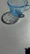 blue glass teacup in the Madrid pattern, a style of Depression glass.
