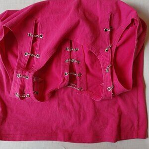 Attractive tank top with splits in the straps and chains riveted on.