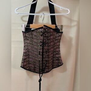 Beautiful Vaacodor brocade corset. Halter neck style with Velcro for easy fit. Features functional hooks in the front and a paisley-like pattern. Adjustable straps in the back. Size small.