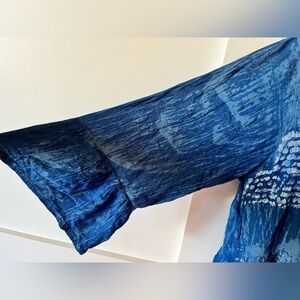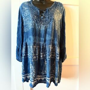 Chic indigo tunic with tie-dye pattern. Features a lace-up neckline. Ideal for casual wear on a hot day