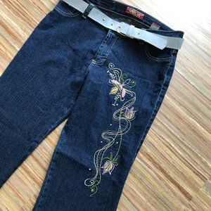 Vintage "The Original Blue Jeans VALE" flare leg denim jeans with floral embroidery & rhinestone design on left leg. Note: front has faux pockets (not real pockets), back pockets are small. Includes light blue faux-leather belt. Made in Mexico, tag says 100% cotton, but fabric has quite a bit of stretch and seems like a cotton/spandex blend. Tag size is women's "13", fits waist size 32", see below for garment measurements. Excellent condition: appears unworn. The pictures show the actual item that you will receive.