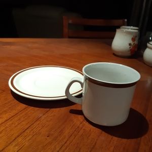 These pieces (8 in total) are part of the Valencia pattern set, from 1981. They are cream coloured and brown rimmed. There are 4 sets of teacups and saucers. No chips or cracks.