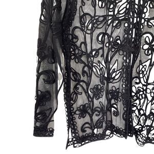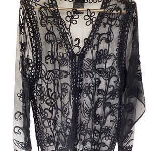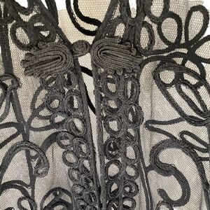 Sheer, long sleeve, 3 closures on front, soutache flat braid embroidered ribbon all over design, EUC, neck to hem 28”, armpit to armpit 22”, armpit to cuff 17”