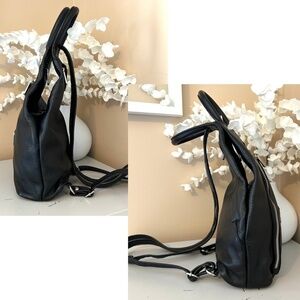 Style, Functional and Impeccable Craftsmanship all in this Valentina Made in Italy Convertible Backpack. Crafted in Black Pebble Soft and Durable Leather. Straps are adjustable and convert from shoulder sling to backpack via built in zipper. Centre opens to a functional space with one zip pocket and two open pockets inside. Front and zipper compartments for quick access to essentials. Handles at top for convenient maneuvering. Canvas lining. Pristine condition inside and out. Silver hardwear also pristine condition. Size is 13” Tall, 8” wide at bottom, 11.5 at centre, 5” at top. Expandable. 4” Deep at bottom. 4” handles. Made in Italy.