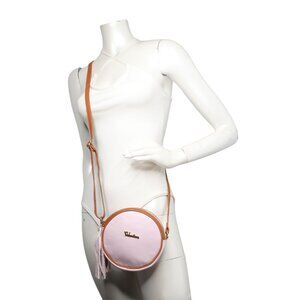 This is a beautiful and chic Valentina Milano Italia Small Round Crossbody Bag. Crafted from genuine Italian leather in a lovely light pink hue with contrasting tan piping and strap. It's the perfect size for your essentials, featuring a gold-tone zip closure and a stylish leather tassel pull.