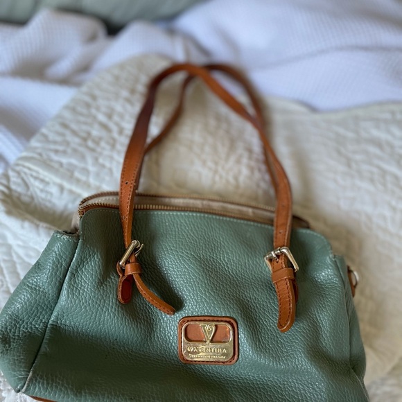 Stylish Valentina bag in sage green. Features durable tan straps. Perfect for daily use.