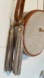 Off white with brown trim leather crossbody with adjustable strap and 2 zippers with tessels for pull