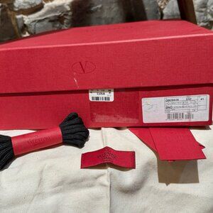 Black suede with tonal shearling lining. Ankle shaft. Padded shearling collar and a reinforced round toe with leather inserts. Leather inserts at counter heel. Hiking-style lace-up front with red and black patterned laces threaded through silver-tone D-rings and signature pyramid studs hooks. Black lug rubber outsoles with deep tread. Made in Italy. Comes with original box, extra laces, tags, and dustbag.