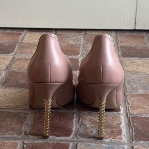 Authentic pink and gold heels. Signature Rockstud pyramid studs is a great statement shoe for any event. Wavy collar at the back with low dip vamp and pointy toe.