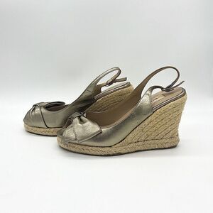 Valentino Garavani “Mena” Peep Toe Espadrille Wedge in Metallic Leather, Size 36