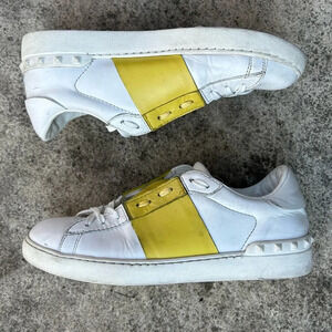 One of Valentino's most famous styles, the low-top Open sneakers are a lesson in casual-chic. In a full white leather construction, and detailed with a yellow stripe detailing and the signature Rockstuds, they will stand out on any occasion.