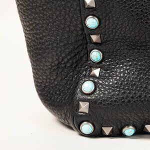 This reversible tote bag from Valentino Garavani's 2016 Resort collection is crafted with a pebbled leather that is black on one side and brown on the other, and features silver-tone hardware, two top handles, Rockstud and turquoise stone embellishments, and a foiled logo on the bottom.