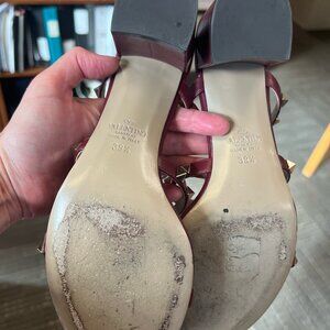 These sandals are in great shape, have been worn for a few summers but it is time to pass them on. They are size 39.5. New, they retail for $1200 CAD. There is no damage to the leather on the heels, toes, or any of the straps. Have all studs intact.