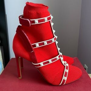 Valentino Garavani Rockstud Sock bootie with suede straps. Stretch knit upper with contrast white piping and rubber effect white studs. Adjustable velcro straps. 105 mm stiletto heel. Size 38.5 They run half size small in my opinion. New in box, although Saks OFF 5TH gave me the wrong box. Comes with dust bag.