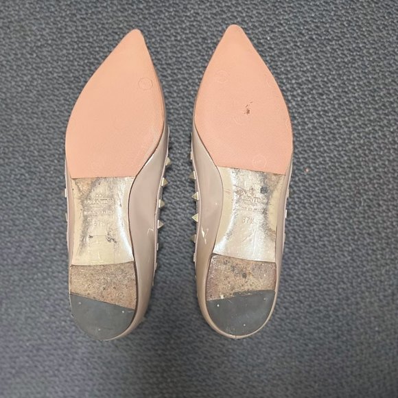 Pointed toe. Signature pyramid studs in pale gold-tone at collar. Suede and leather lining in beige. Beige leather sole.