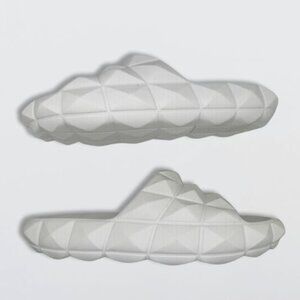 Bold and futuristic, these Valentino Garavani slide sandals feature a sculptural geometric design in crisp white. Made for standout comfort and edgy street style, they embody the brand’s modern take on luxury. |