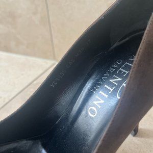 Valentino Garavani brown suede 3 inch heels with square toe and bow embellishment. Worn once and resoled, in excellent condition. EU size 37.