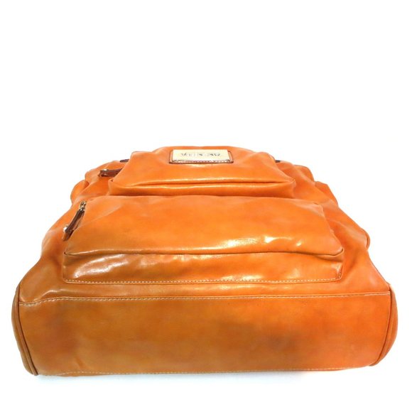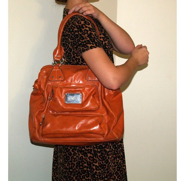 Soft leather in a pretty shade of tan / orange - perfect for fall and winter. Large storage with some zippered outside and inside pockets. Nice zippered area inside with two open pouches to hold phone or keys. Take this nice satchel everywhere. The color blends in with many outfits. A great everyday, any occasion satchel bag, afterwards jeans dress romper with flats or sandals - it will look just fine. Because of the soft leather, the satchel can be easily stored flat.