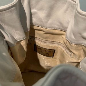 Made in Italy. Vintage Bucket Purse in light creamy grey with gold hardware. Excellent condition with minimal wear on bottom seam as seen in pictures. Adjustable strap. Size: 11" height, 8.75" width, 5.5" depth (bottom). Leather.