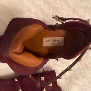 Suede Rockstud Double Buckle High Heel Ankle Boots 37.5 Burgundy - These chic strap ankle boots are crafted of maroon suede leather. The boot features an elongated pointed toe, a four inch sharp stiletto and is open with a cage of leather straps lined with gold pyramid studs, excellent heels for a bold impression from Valentino! I’m excellent condition and worn only once! Minor scuffing on bottom of boot as photographed. Selling because they are too small for me.
