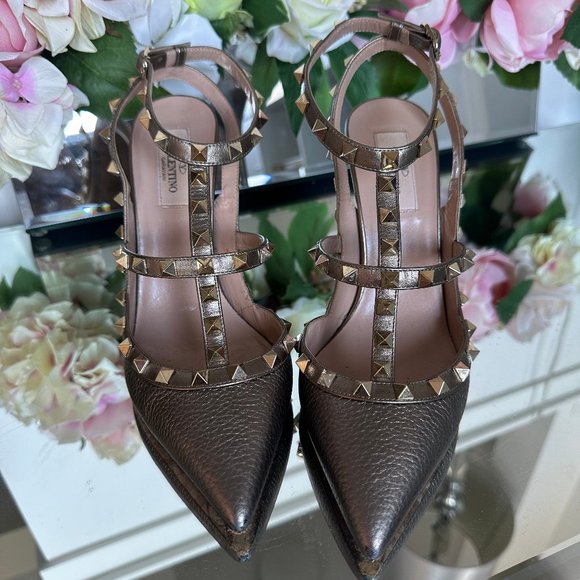 Purchased in Vancouver, these Rockstuds are a gorgeous dark bronze/ gold pebbled leather with matching studs. Minor scratches on the toe area and heel as can be seen in the photos. If you're familiar with Rockstuds already you know just how comfortable these heels are.