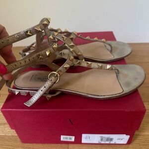 Step into luxury with Valentino's gold rock stud gladiator sandals, featuring a striking studded design and multiple straps for a secure fit. Crafted with a metallic finish, these sandals blend elegance and edge effortlessly. Perfect for making a statement, they offer comfort with a flat sole and slight heel. Purchased for $975 and worn a few times but in great condition. I had a Toppy sole applied before first wear to protect sole and avoid slipping. Size 36 (women’s 6) and fit true to size.