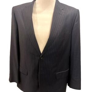 Elevate your formal attire with this classic Valentino blazer. Made of high-quality wool and lined with polyester, this navy blazer features a striped pattern, four-button sleeve button style, and double-vented jacket vent style. It is perfect for any occasion, whether it is a wedding, party, cocktail event, or business meeting. With a classic fit and single-breasted cut, this blazer has a two-button front button style and inner pockets for added convenience. It is available in size 46 and is suitable for regular-sized men. This blazer is perfect for any season, whether it is winter, summer, fall, or spring. Made in Italy and designed with timeless elegance, this blazer is a must-have for any fashion-conscious man.