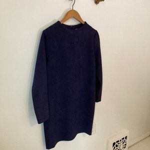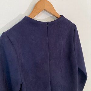 Beautiful dress from Valerie Dumaine with a semi high structured neckline and soft tailoring.It's fitted without being tight, narrowing at the hip. The super soft scuba suede fabric makes this little navy dress so nice to wear to parties or the office. 92% Polyester, 8% Spandex. Only worn a few times - in excellent used condition.