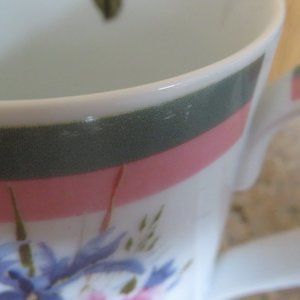 Valerie Pfeiffer Innovation Giftware Corp. porcelain cup, made in Malaysia. Has floral design all around. This cup is oven. dishwasher, microwave and freezer safe. Measures 3.5" high and 4.25" wide. Approx. 8 oz. capacity.