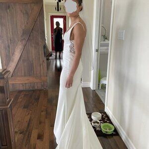 This dress was bought new, worn once, was professionally cleaned after, and is in perfect condition. The label size is 8, but it fits like a 4. It was slightly altered for length, shoulder strap, and taken in slightly around the waist, as well as an inside bustle added (see dance floor photo for bustle). This was really the gown of my dreams for its incredible lightness, buttery crepe material, simple and elegant fit, and of course the perfectly tasteful lace work along the low back. Made with Love veil (pictured) included.