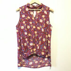 Excellent preowned condition, burgundy-red, sleeveless, twist hem, halter-like neck, keyhole blouse by Valleygirl with a floral pattern in primary colours of ecru, blue, black, white. Valleygirl is an Australian brand! Don't see that very often here. So many things going on with this tank top. It is definitely unique, as well as versatile. If you're looking for something bold and unafraid, this is it.