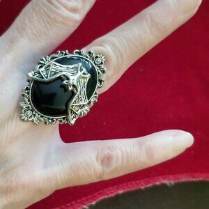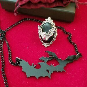 I paired it with a flat black bat necklace. The bats are shiny plastic but look like metal. Each side of chain is 10"