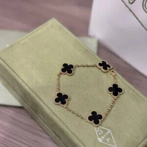 Elegant Van Cleef & Arpels bracelet featuring iconic gold clover motifs. Perfect for adding a touch of luxury to any outfit.