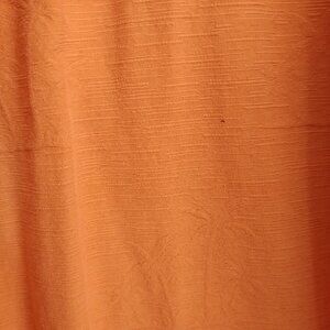 Thick raw silk/slub silk look. Faint palm tree pattern throughout, also in orange. Very cool wooden buttons. Some small tiny dark marks throughout the fabric - as they are scattered throughout, they may just be natural imperfections. Please see final two photos.