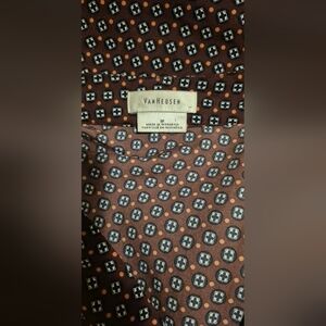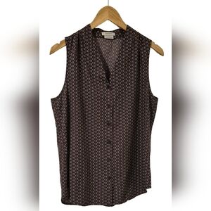 This elegant sleeveless blouse from Van Heusen features a notched collar and a buttoned front, crafted in a lightweight fabric with a subtle geometric print in red and blue. Its classic design offers versatility, making it an ideal choice for warm weather wear.